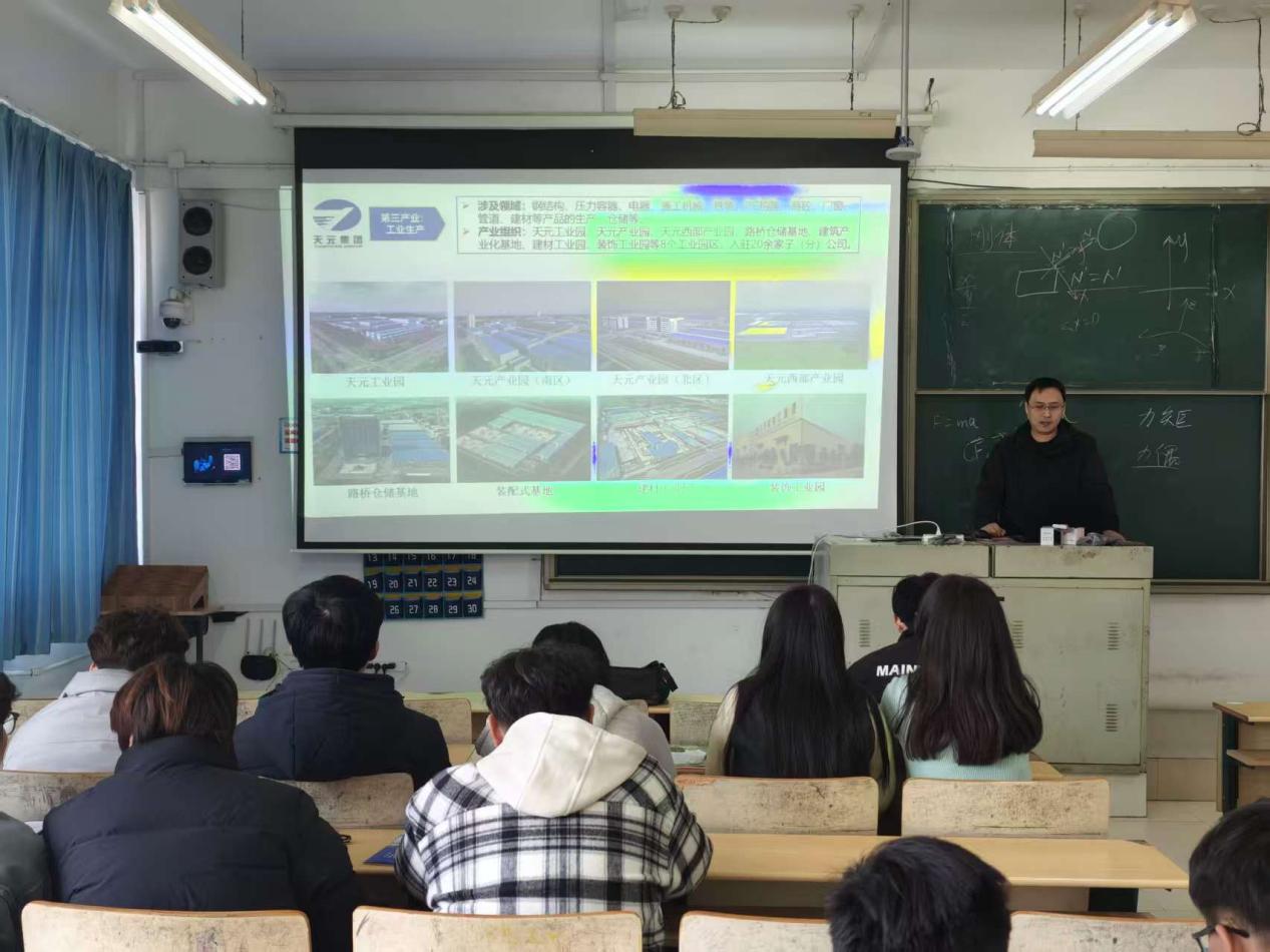 宣讲会上,天元集团人力资源部杨亮通过PPT演示与案例分享,全方位解读企业发展概况、经营战略、市场布局,让同学们直观了解企业的发展规模与行业优势。